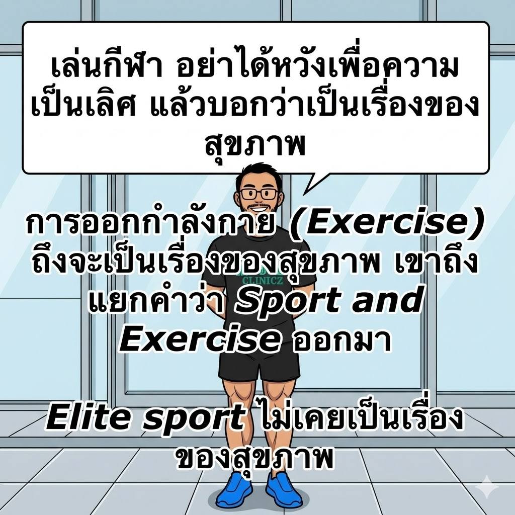 ถ้าพูดกันกลางๆคือ การออกกำลังกาย (Exercise) มันคือการฝึกเพื่อทำให้ร่างกาย #ดีขึ้นในระยะยาว ... แต่ sport โดยเฉพาะระดับแข่งขัน มันคือการเอาร่างกายไป #รีดศักยภาพ จนสุดขอบ ว่าจะไปได้ไกลแค่ไหนภายใต้กติกานั้นๆ ซึ่งมันอาจจะไม่ใช่สัญญานว่าสุขภาพดีขึ้น มันแค่สัญญาว่า ถ้าทนได้ ก็อาจจะจะเก่งขึ้น
